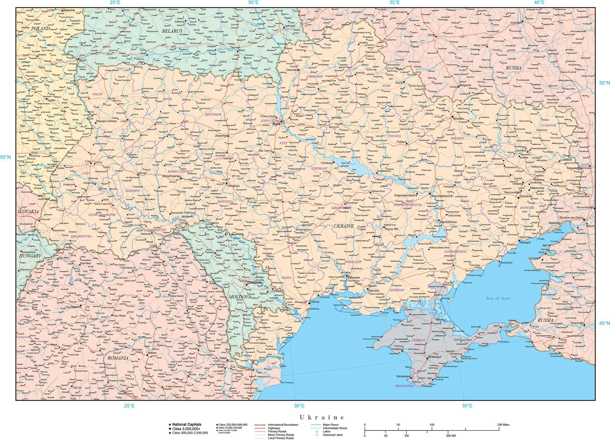 Ukraine and Crimea Map with Cities and Provinces